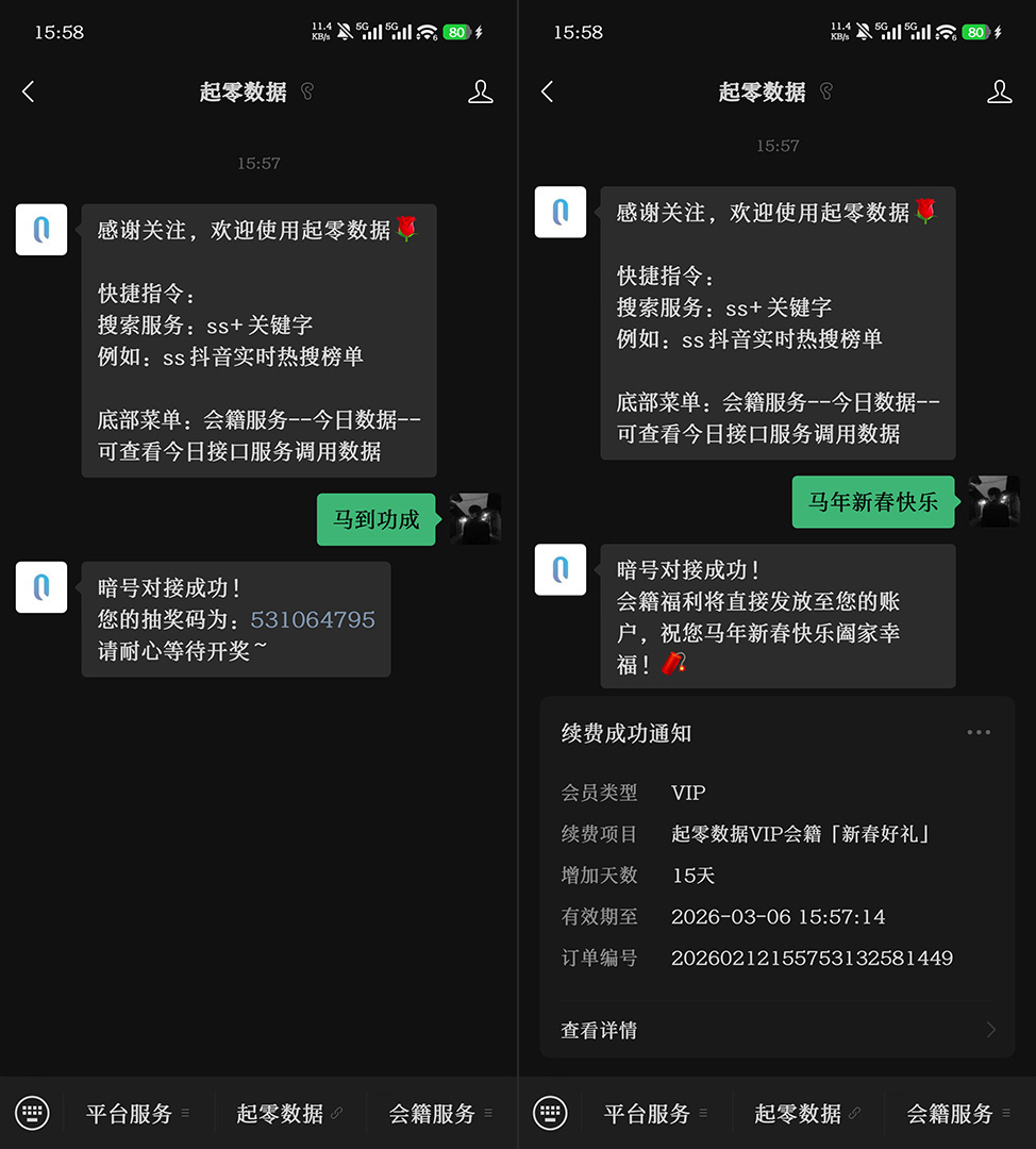 🎁 活动2️⃣:关注「起零数据」微信公众号,在公众号内回复神秘暗号:“马年新春快乐”,即可获得平台赠送的增值会籍服务。