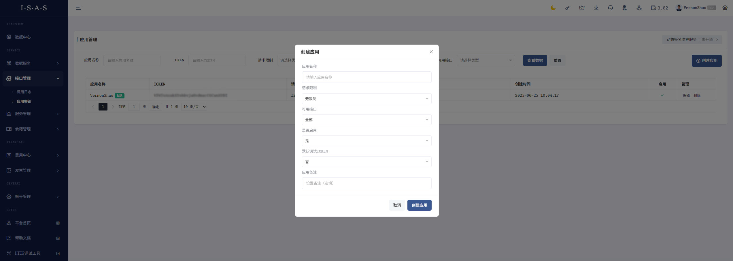 登录控制台后获取接口所需要的TOKEN密钥 1.1.控制台右上角--TOKEN 1.2.接口管理--应用管理